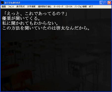 見た目がカワイイ包丁さんから殺されないように夜の学校を探索してまわります。包丁さんに見つかる以外にも一撃死の選択肢があるのでセーブはこまめにしましょう。画面切り替えの度にBGMが途切れなければよかったのですが。
